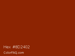 Hex #8d2402 Color is a dark color and the nearest color is Totem Pole #991b07. Hex code #8d2402 and RGB value is rgb(141,36,2). In RGB color space, this color is composed of 55% red, 14% green, 1% blue, In CMYK color space, this color is composed of 0% cyan, 74% magenta, 99% yellow , 45% black , In HSL color space, this color has a hue angle of 15° , 97% saturation and 28% lightness.