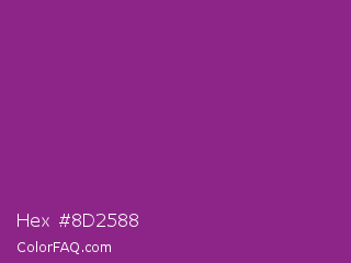 Hex #8d2588 Color is a normal magenta color and the nearest color is Razzmic Berry Crayola #843179. Hex code #8d2588 and RGB value is rgb(141,37,136). In RGB color space, this color is composed of 55% red, 15% green, 53% blue, In CMYK color space, this color is composed of 0% cyan, 74% magenta, 4% yellow , 45% black , In HSL color space, this color has a hue angle of 303° , 58% saturation and 35% lightness.