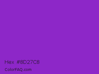 Hex #8d27c8 Color is a normal purple color and the nearest color is Dark Orchid #9932cc. Hex code #8d27c8 and RGB value is rgb(141,39,200). In RGB color space, this color is composed of 55% red, 15% green, 78% blue, In CMYK color space, this color is composed of 30% cyan, 81% magenta, 0% yellow , 22% black , In HSL color space, this color has a hue angle of 278° , 67% saturation and 47% lightness.