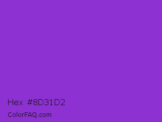 Hex #8d31d2 Color is a normal purple color and the nearest color is Dark Orchid #9932cc. Hex code #8d31d2 and RGB value is rgb(141,49,210). In RGB color space, this color is composed of 55% red, 19% green, 82% blue, In CMYK color space, this color is composed of 33% cyan, 77% magenta, 0% yellow , 18% black , In HSL color space, this color has a hue angle of 274° , 64% saturation and 51% lightness.