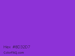 Hex #8d32d7 Color is a normal purple color and the nearest color is Blue Violet #8a2be2. Hex code #8d32d7 and RGB value is rgb(141,50,215). In RGB color space, this color is composed of 55% red, 20% green, 84% blue, In CMYK color space, this color is composed of 34% cyan, 77% magenta, 0% yellow , 16% black , In HSL color space, this color has a hue angle of 273° , 67% saturation and 52% lightness.