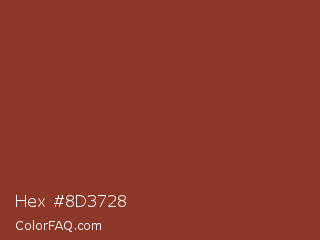 Hex #8d3728 Color is a normal red color and the nearest color is Burnt Umber #8a3324. Hex code #8d3728 and RGB value is rgb(141,55,40). In RGB color space, this color is composed of 55% red, 22% green, 16% blue, In CMYK color space, this color is composed of 0% cyan, 61% magenta, 72% yellow , 45% black , In HSL color space, this color has a hue angle of 9° , 56% saturation and 35% lightness.