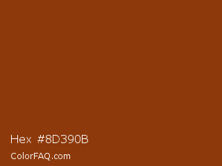 Hex #8d390b Color is a dark orange color and the nearest color is Saddle Brown #8b4513. Hex code #8d390b and RGB value is rgb(141,57,11). In RGB color space, this color is composed of 55% red, 22% green, 4% blue, In CMYK color space, this color is composed of 0% cyan, 60% magenta, 92% yellow , 45% black , In HSL color space, this color has a hue angle of 21° , 86% saturation and 30% lightness.