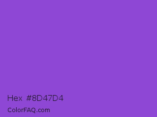 Hex #8d47d4 Color is a normal violet color and the nearest color is Dark Orchid #9932cc. Hex code #8d47d4 and RGB value is rgb(141,71,212). In RGB color space, this color is composed of 55% red, 28% green, 83% blue, In CMYK color space, this color is composed of 33% cyan, 67% magenta, 0% yellow , 17% black , In HSL color space, this color has a hue angle of 270° , 62% saturation and 55% lightness.