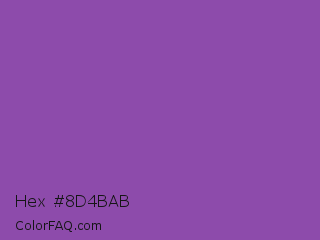 Hex #8d4bab Color is a normal purple color and the nearest color is Purpureus #9a4eae. Hex code #8d4bab and RGB value is rgb(141,75,171). In RGB color space, this color is composed of 55% red, 29% green, 67% blue, In CMYK color space, this color is composed of 18% cyan, 56% magenta, 0% yellow , 33% black , In HSL color space, this color has a hue angle of 281° , 39% saturation and 48% lightness.