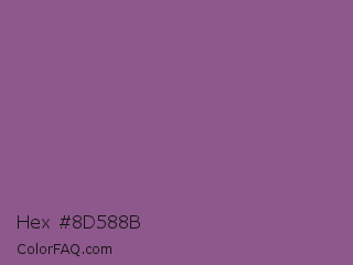Hex #8d588b Color is a normal magenta color and the nearest color is Antique Fuchsia #915c83. Hex code #8d588b and RGB value is rgb(141,88,139). In RGB color space, this color is composed of 55% red, 35% green, 55% blue, In CMYK color space, this color is composed of 0% cyan, 38% magenta, 1% yellow , 45% black , In HSL color space, this color has a hue angle of 302° , 23% saturation and 45% lightness.