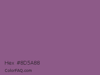 Hex #8d5a88 Color is a normal magenta color and the nearest color is Antique Fuchsia #915c83. Hex code #8d5a88 and RGB value is rgb(141,90,136). In RGB color space, this color is composed of 55% red, 35% green, 53% blue, In CMYK color space, this color is composed of 0% cyan, 36% magenta, 4% yellow , 45% black , In HSL color space, this color has a hue angle of 306° , 22% saturation and 45% lightness.