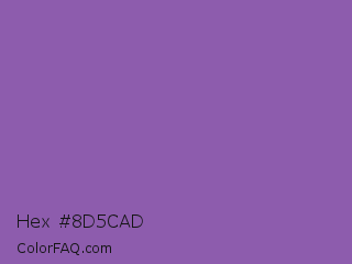 Hex #8d5cad Color is a normal purple color and the nearest color is Purpureus #9a4eae. Hex code #8d5cad and RGB value is rgb(141,92,173). In RGB color space, this color is composed of 55% red, 36% green, 68% blue, In CMYK color space, this color is composed of 18% cyan, 47% magenta, 0% yellow , 32% black , In HSL color space, this color has a hue angle of 276° , 33% saturation and 52% lightness.