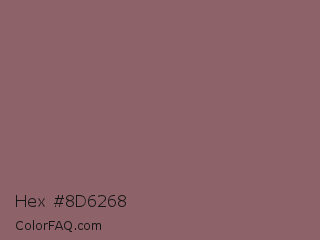 Hex #8d6268 Color is a normal red color and the nearest color is Mauve Taupe #915f6d. Hex code #8d6268 and RGB value is rgb(141,98,104). In RGB color space, this color is composed of 55% red, 38% green, 41% blue, In CMYK color space, this color is composed of 0% cyan, 30% magenta, 26% yellow , 45% black , In HSL color space, this color has a hue angle of 352° , 18% saturation and 47% lightness.