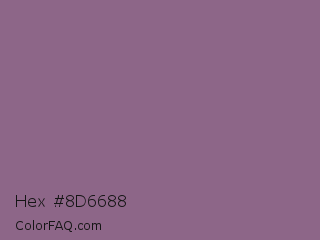 Hex #8d6688 Color is a normal magenta color and the nearest color is Strikemaster #956387. Hex code #8d6688 and RGB value is rgb(141,102,136). In RGB color space, this color is composed of 55% red, 40% green, 53% blue, In CMYK color space, this color is composed of 0% cyan, 28% magenta, 4% yellow , 45% black , In HSL color space, this color has a hue angle of 308° , 16% saturation and 48% lightness.
