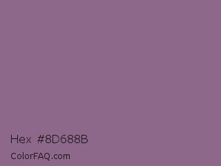 Hex #8d688b Color is a normal magenta color and the nearest color is Strikemaster #956387. Hex code #8d688b and RGB value is rgb(141,104,139). In RGB color space, this color is composed of 55% red, 41% green, 55% blue, In CMYK color space, this color is composed of 0% cyan, 26% magenta, 1% yellow , 45% black , In HSL color space, this color has a hue angle of 303° , 15% saturation and 48% lightness.