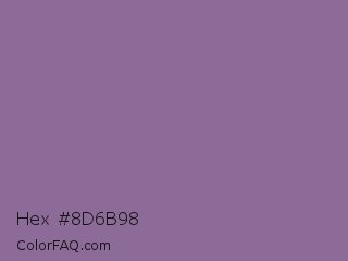 Hex #8d6b98 Color is a normal purple color and the nearest color is Trendy Pink #8c6495. Hex code #8d6b98 and RGB value is rgb(141,107,152). In RGB color space, this color is composed of 55% red, 42% green, 60% blue, In CMYK color space, this color is composed of 7% cyan, 30% magenta, 0% yellow , 40% black , In HSL color space, this color has a hue angle of 285° , 18% saturation and 51% lightness.