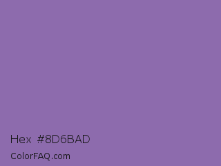 Hex #8d6bad Color is a normal purple color and the nearest color is Wisteria #9771b5. Hex code #8d6bad and RGB value is rgb(141,107,173). In RGB color space, this color is composed of 55% red, 42% green, 68% blue, In CMYK color space, this color is composed of 18% cyan, 38% magenta, 0% yellow , 32% black , In HSL color space, this color has a hue angle of 271° , 29% saturation and 55% lightness.