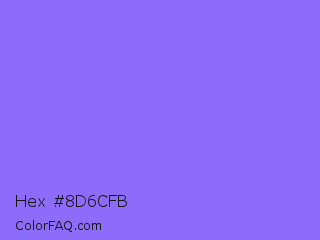 Hex #8d6cfb Color is a light indigo color and the nearest color is Medium Slate Blue #7b68ee. Hex code #8d6cfb and RGB value is rgb(141,108,251). In RGB color space, this color is composed of 55% red, 42% green, 98% blue, In CMYK color space, this color is composed of 44% cyan, 57% magenta, 0% yellow , 2% black , In HSL color space, this color has a hue angle of 254° , 95% saturation and 70% lightness.