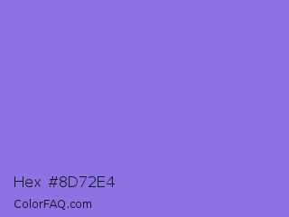 Hex #8d72e4 Color is a light indigo color and the nearest color is Medium Purple #9370db. Hex code #8d72e4 and RGB value is rgb(141,114,228). In RGB color space, this color is composed of 55% red, 45% green, 89% blue, In CMYK color space, this color is composed of 38% cyan, 50% magenta, 0% yellow , 11% black , In HSL color space, this color has a hue angle of 254° , 68% saturation and 67% lightness.