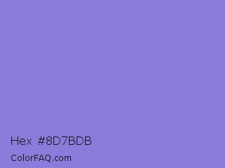 Hex #8d7bdb Color is a light indigo color and the nearest color is True V #8a73d6. Hex code #8d7bdb and RGB value is rgb(141,123,219). In RGB color space, this color is composed of 55% red, 48% green, 86% blue, In CMYK color space, this color is composed of 36% cyan, 44% magenta, 0% yellow , 14% black , In HSL color space, this color has a hue angle of 251° , 57% saturation and 67% lightness.