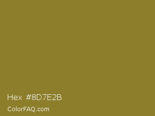 Hex #8d7e2b Color is a normal yellow color and the nearest color is Old Moss Green #867e36. Hex code #8d7e2b and RGB value is rgb(141,126,43). In RGB color space, this color is composed of 55% red, 49% green, 17% blue, In CMYK color space, this color is composed of 0% cyan, 11% magenta, 70% yellow , 45% black , In HSL color space, this color has a hue angle of 51° , 53% saturation and 36% lightness.