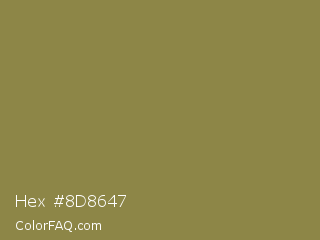 Hex #8d8647 Color is a normal yellow color and the nearest color is Dark Tan #918151. Hex code #8d8647 and RGB value is rgb(141,134,71). In RGB color space, this color is composed of 55% red, 53% green, 28% blue, In CMYK color space, this color is composed of 0% cyan, 5% magenta, 50% yellow , 45% black , In HSL color space, this color has a hue angle of 54° , 33% saturation and 42% lightness.