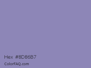 Hex #8d86b7 Color is a light indigo color and the nearest color is Lavender Purple #967bb6. Hex code #8d86b7 and RGB value is rgb(141,134,183). In RGB color space, this color is composed of 55% red, 53% green, 72% blue, In CMYK color space, this color is composed of 23% cyan, 27% magenta, 0% yellow , 28% black , In HSL color space, this color has a hue angle of 249° , 25% saturation and 62% lightness.