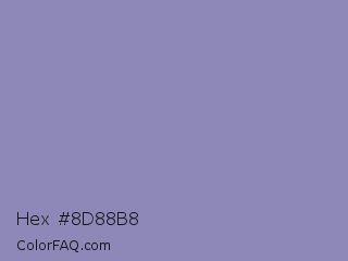 Hex #8d88b8 Color is a light indigo color and the nearest color is Cool Grey #8c92ac. Hex code #8d88b8 and RGB value is rgb(141,136,184). In RGB color space, this color is composed of 55% red, 53% green, 72% blue, In CMYK color space, this color is composed of 23% cyan, 26% magenta, 0% yellow , 28% black , In HSL color space, this color has a hue angle of 246° , 25% saturation and 63% lightness.