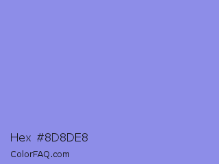 Hex #8d8de8 Color is a light blue color and the nearest color is Portage #8b9fee. Hex code #8d8de8 and RGB value is rgb(141,141,232). In RGB color space, this color is composed of 55% red, 55% green, 91% blue, In CMYK color space, this color is composed of 39% cyan, 39% magenta, 0% yellow , 9% black , In HSL color space, this color has a hue angle of 240° , 66% saturation and 73% lightness.