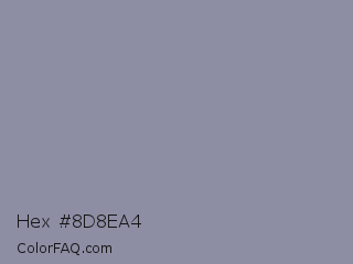 Hex #8d8ea4 Color is a normal blue color and the nearest color is Manatee Crayola #8d90a1. Hex code #8d8ea4 and RGB value is rgb(141,142,164). In RGB color space, this color is composed of 55% red, 56% green, 64% blue, In CMYK color space, this color is composed of 14% cyan, 13% magenta, 0% yellow , 36% black , In HSL color space, this color has a hue angle of 237° , 11% saturation and 60% lightness.