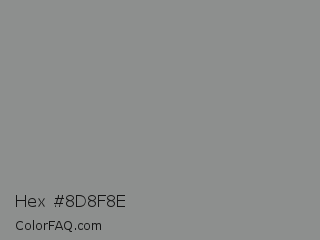 Hex #8d8f8e Color is a normal green color and the nearest color is Stack #8a8f8a. Hex code #8d8f8e and RGB value is rgb(141,143,142). In RGB color space, this color is composed of 55% red, 56% green, 56% blue, In CMYK color space, this color is composed of 1% cyan, 0% magenta, 1% yellow , 44% black , In HSL color space, this color has a hue angle of 150° , 1% saturation and 56% lightness.