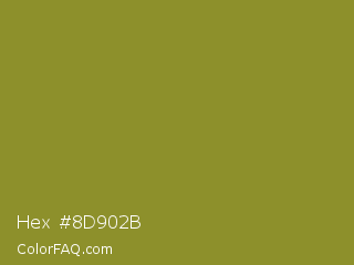 Hex #8d902b Color is a normal yellow color and the nearest color is Sycamore #908d39. Hex code #8d902b and RGB value is rgb(141,144,43). In RGB color space, this color is composed of 55% red, 56% green, 17% blue, In CMYK color space, this color is composed of 2% cyan, 0% magenta, 70% yellow , 44% black , In HSL color space, this color has a hue angle of 62° , 54% saturation and 37% lightness.