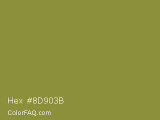 Hex #8d903b Color is a normal yellow color and the nearest color is Sycamore #908d39. Hex code #8d903b and RGB value is rgb(141,144,59). In RGB color space, this color is composed of 55% red, 56% green, 23% blue, In CMYK color space, this color is composed of 2% cyan, 0% magenta, 59% yellow , 44% black , In HSL color space, this color has a hue angle of 62° , 42% saturation and 40% lightness.