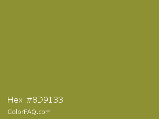 Hex #8d9133 Color is a normal yellow color and the nearest color is Sycamore #908d39. Hex code #8d9133 and RGB value is rgb(141,145,51). In RGB color space, this color is composed of 55% red, 57% green, 20% blue, In CMYK color space, this color is composed of 3% cyan, 0% magenta, 65% yellow , 43% black , In HSL color space, this color has a hue angle of 63° , 48% saturation and 38% lightness.