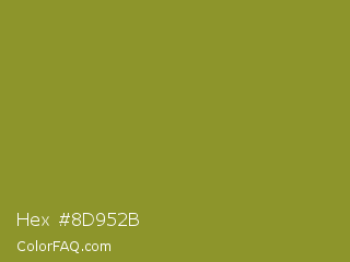 Hex #8d952b Color is a normal yellow color and the nearest color is Sycamore #908d39. Hex code #8d952b and RGB value is rgb(141,149,43). In RGB color space, this color is composed of 55% red, 58% green, 17% blue, In CMYK color space, this color is composed of 5% cyan, 0% magenta, 71% yellow , 42% black , In HSL color space, this color has a hue angle of 65° , 55% saturation and 38% lightness.