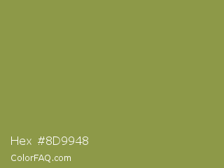 Hex #8d9948 Color is a normal yellow color and the nearest color is Moss Green #8a9a5b. Hex code #8d9948 and RGB value is rgb(141,153,72). In RGB color space, this color is composed of 55% red, 60% green, 28% blue, In CMYK color space, this color is composed of 8% cyan, 0% magenta, 53% yellow , 40% black , In HSL color space, this color has a hue angle of 69° , 36% saturation and 44% lightness.