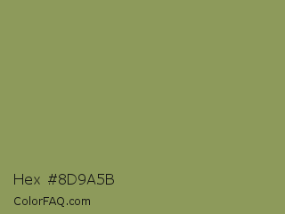 Hex #8d9a5b Color is a normal lime color and the nearest color is Moss Green #8a9a5b. Hex code #8d9a5b and RGB value is rgb(141,154,91). In RGB color space, this color is composed of 55% red, 60% green, 36% blue, In CMYK color space, this color is composed of 8% cyan, 0% magenta, 41% yellow , 40% black , In HSL color space, this color has a hue angle of 72° , 26% saturation and 48% lightness.