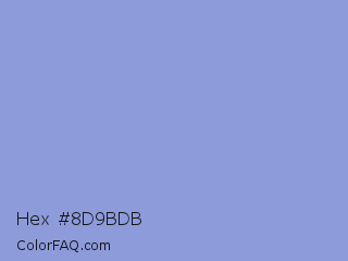 Hex #8d9bdb Color is a light blue color and the nearest color is Ceil #92a1cf. Hex code #8d9bdb and RGB value is rgb(141,155,219). In RGB color space, this color is composed of 55% red, 61% green, 86% blue, In CMYK color space, this color is composed of 36% cyan, 29% magenta, 0% yellow , 14% black , In HSL color space, this color has a hue angle of 229° , 52% saturation and 71% lightness.