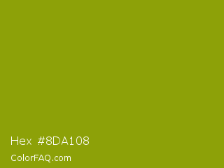 Hex #8da108 Color is a normal yellow color and the nearest color is Apple Green #8db600. Hex code #8da108 and RGB value is rgb(141,161,8). In RGB color space, this color is composed of 55% red, 63% green, 3% blue, In CMYK color space, this color is composed of 12% cyan, 0% magenta, 95% yellow , 37% black , In HSL color space, this color has a hue angle of 68° , 91% saturation and 33% lightness.