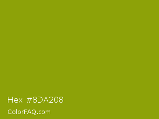 Hex #8da208 Color is a normal yellow color and the nearest color is Apple Green #8db600. Hex code #8da208 and RGB value is rgb(141,162,8). In RGB color space, this color is composed of 55% red, 64% green, 3% blue, In CMYK color space, this color is composed of 13% cyan, 0% magenta, 95% yellow , 36% black , In HSL color space, this color has a hue angle of 68° , 91% saturation and 33% lightness.