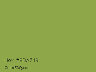 Hex #8da749 Color is a normal lime color and the nearest color is Sushi #87ab39. Hex code #8da749 and RGB value is rgb(141,167,73). In RGB color space, this color is composed of 55% red, 65% green, 29% blue, In CMYK color space, this color is composed of 16% cyan, 0% magenta, 56% yellow , 35% black , In HSL color space, this color has a hue angle of 77° , 39% saturation and 47% lightness.