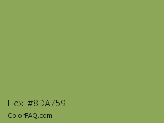 Hex #8da759 Color is a normal green color and the nearest color is Chelsea Cucumber #83aa5d. Hex code #8da759 and RGB value is rgb(141,167,89). In RGB color space, this color is composed of 55% red, 65% green, 35% blue, In CMYK color space, this color is composed of 16% cyan, 0% magenta, 47% yellow , 35% black , In HSL color space, this color has a hue angle of 80° , 31% saturation and 50% lightness.
