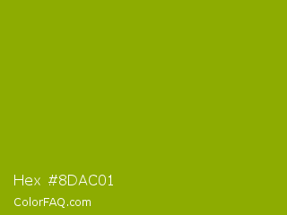 Hex #8dac01 Color is a normal lime color and the nearest color is Apple Green #8db600. Hex code #8dac01 and RGB value is rgb(141,172,1). In RGB color space, this color is composed of 55% red, 67% green, 0% blue, In CMYK color space, this color is composed of 18% cyan, 0% magenta, 99% yellow , 33% black , In HSL color space, this color has a hue angle of 71° , 99% saturation and 34% lightness.