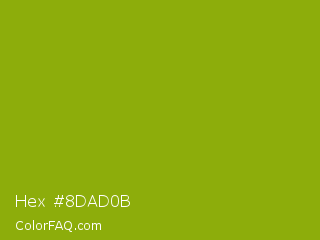Hex #8dad0b Color is a normal lime color and the nearest color is Apple Green #8db600. Hex code #8dad0b and RGB value is rgb(141,173,11). In RGB color space, this color is composed of 55% red, 68% green, 4% blue, In CMYK color space, this color is composed of 18% cyan, 0% magenta, 94% yellow , 32% black , In HSL color space, this color has a hue angle of 72° , 88% saturation and 36% lightness.