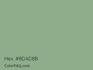 Hex #8dad8b Color is a light green color and the nearest color is Envy #8ba690. Hex code #8dad8b and RGB value is rgb(141,173,139). In RGB color space, this color is composed of 55% red, 68% green, 55% blue, In CMYK color space, this color is composed of 18% cyan, 0% magenta, 20% yellow , 32% black , In HSL color space, this color has a hue angle of 116° , 17% saturation and 61% lightness.