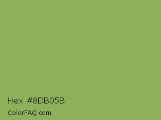 Hex #8db05b Color is a normal green color and the nearest color is Chelsea Cucumber #83aa5d. Hex code #8db05b and RGB value is rgb(141,176,91). In RGB color space, this color is composed of 55% red, 69% green, 36% blue, In CMYK color space, this color is composed of 20% cyan, 0% magenta, 48% yellow , 31% black , In HSL color space, this color has a hue angle of 85° , 35% saturation and 52% lightness.