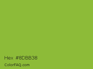 Hex #8dbb38 Color is a normal green color and the nearest color is Sushi #87ab39. Hex code #8dbb38 and RGB value is rgb(141,187,56). In RGB color space, this color is composed of 55% red, 73% green, 22% blue, In CMYK color space, this color is composed of 25% cyan, 0% magenta, 70% yellow , 27% black , In HSL color space, this color has a hue angle of 81° , 54% saturation and 48% lightness.