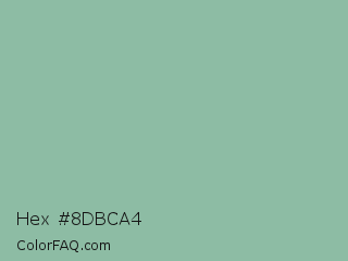 Hex #8dbca4 Color is a light green color and the nearest color is Summer Green #96bbab. Hex code #8dbca4 and RGB value is rgb(141,188,164). In RGB color space, this color is composed of 55% red, 74% green, 64% blue, In CMYK color space, this color is composed of 25% cyan, 0% magenta, 13% yellow , 26% black , In HSL color space, this color has a hue angle of 149° , 26% saturation and 65% lightness.