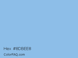 Hex #8dbee8 Color is a light blue color and the nearest color is Jordy Blue #8ab9f1. Hex code #8dbee8 and RGB value is rgb(141,190,232). In RGB color space, this color is composed of 55% red, 75% green, 91% blue, In CMYK color space, this color is composed of 39% cyan, 18% magenta, 0% yellow , 9% black , In HSL color space, this color has a hue angle of 208° , 66% saturation and 73% lightness.