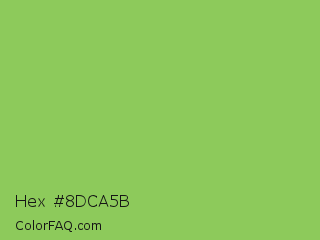 Hex #8dca5b Color is a normal green color and the nearest color is Dollar Bill #85bb65. Hex code #8dca5b and RGB value is rgb(141,202,91). In RGB color space, this color is composed of 55% red, 79% green, 36% blue, In CMYK color space, this color is composed of 30% cyan, 0% magenta, 55% yellow , 21% black , In HSL color space, this color has a hue angle of 93° , 51% saturation and 57% lightness.