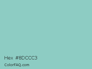 Hex #8dccc3 Color is a light cyan color and the nearest color is Monte Carlo #83d0c6. Hex code #8dccc3 and RGB value is rgb(141,204,195). In RGB color space, this color is composed of 55% red, 80% green, 76% blue, In CMYK color space, this color is composed of 31% cyan, 0% magenta, 4% yellow , 20% black , In HSL color space, this color has a hue angle of 171° , 38% saturation and 68% lightness.