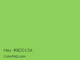Hex #8dd15a Color is a normal green color and the nearest color is Dollar Bill #85bb65. Hex code #8dd15a and RGB value is rgb(141,209,90). In RGB color space, this color is composed of 55% red, 82% green, 35% blue, In CMYK color space, this color is composed of 33% cyan, 0% magenta, 57% yellow , 18% black , In HSL color space, this color has a hue angle of 94° , 56% saturation and 59% lightness.