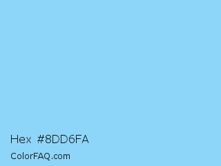 Hex #8dd6fa Color is a light blue color and the nearest color is Pale Cyan #87d3f8. Hex code #8dd6fa and RGB value is rgb(141,214,250). In RGB color space, this color is composed of 55% red, 84% green, 98% blue, In CMYK color space, this color is composed of 44% cyan, 14% magenta, 0% yellow , 2% black , In HSL color space, this color has a hue angle of 200° , 92% saturation and 77% lightness.