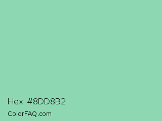 Hex #8dd8b2 Color is a light green color and the nearest color is Vista Blue #8fd6b4. Hex code #8dd8b2 and RGB value is rgb(141,216,178). In RGB color space, this color is composed of 55% red, 85% green, 70% blue, In CMYK color space, this color is composed of 35% cyan, 0% magenta, 18% yellow , 15% black , In HSL color space, this color has a hue angle of 150° , 49% saturation and 70% lightness.